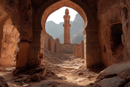 An archway leading to the grand mosque of Olderuc, with its tall minaret and intricate carvings. The photo captures the architectural beauty and spiritual significance of such places of worship in Omani culture. Wide-angle lens, natural lighting. --ar 3:2 --v 6.1 Job ID: 53776549-ea3e-4224-b297-5be5823bab81