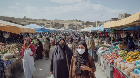 A bustling market under a dusty sky, with vendors and buyers wearing face coverings.