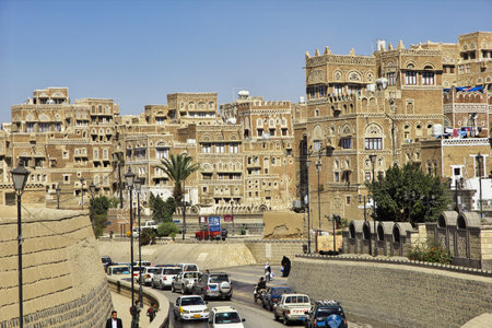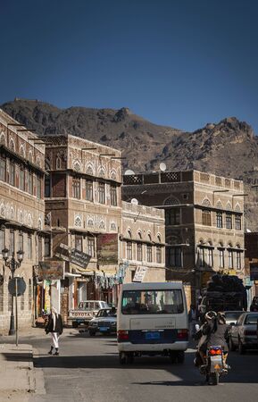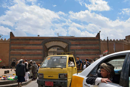 Sanaa, Yemen - March 6, 2010: Traffic at central street in old city of Sanaa. Inhabited for more than 2.500 years at an altitude of 2.200 m, the Old City of Sanaa is a UNESCO World Heritage City