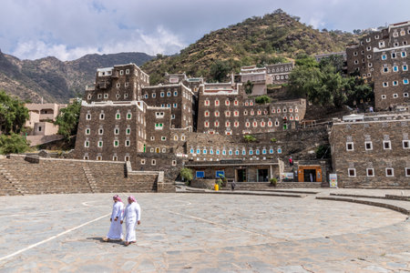 RIJAL ALMA, SAUDI ARABIA - NOVEMBER 20, 2021: Local men in ancient Rijal Alma village, Saudi Arabia