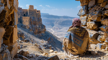 A man in a traditional clothes sits on the edge of the cliff and looks at the ruins of Masada fortress in Israel