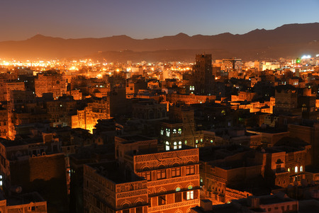 The capital of Yemen. View on the old city from roof at night