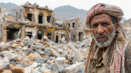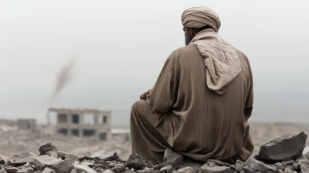 Man in traditional Middle Eastern clothing sitting on rubble, looking at destroyed buildings. Concept of war, displacement, and loss.