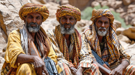 Three men in colorful traditional outfits sit together in a desert displaying their unique cultural attire and expressions.