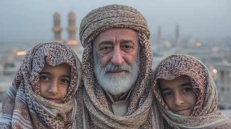 Elder man with two children in Jeddah traditional attire, highlighting cultural heritage and bonds