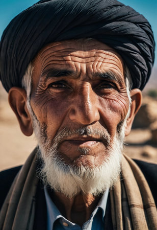 An elderly man from Afghanistan showcases his weathered face, reflecting years of wisdom and resilience against a modest backdrop of nature, embodying the rich culture of his homeland. Generative AI.