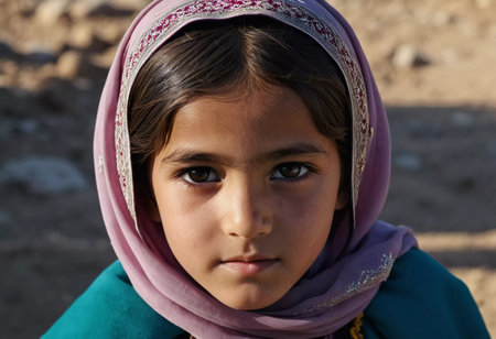 A young girl from Afghanistan stands confidently, showcasing her traditional attire, her expressive eyes reflecting her surroundings and culture. Generative AI.