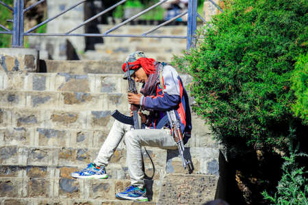 Gondar, Ethiopia - December 01, 2020: African Ranger prepares with the Gun for Escorting of the Tourists to the Simien Mountains