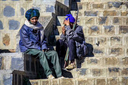RIJAL ALMA, SAUDI ARABIA - NOVEMBER 20, 2021: Local men in ancient Rijal Alma village, Saudi Arabia