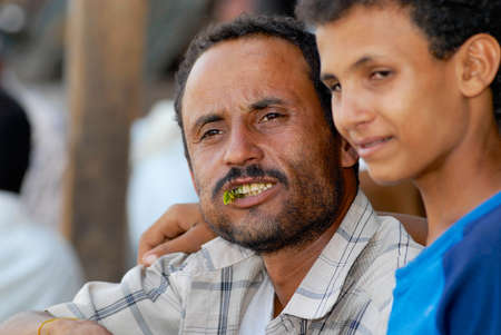 LAHIJ, YEMEN - SEPTEMBER 15, 2006: Man chews khat (Catha edulis) at the local market in Lahij, Yemen. Chewing khat (drug of abuse) is a major social problem in Yemen.