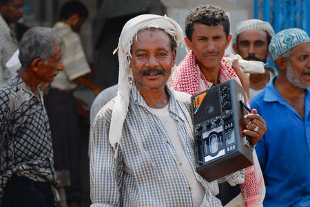 Al Hudaydah, Yemen - September 17, 2006: Unidentified Yemeni man holds vintage tape recorder at the street in Al Hudaydah, Yemen.