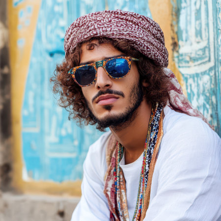 A fashion forward young man wearing sunglasses and traditional attire sits against a colorful wall showcasing cultural style and attitude.