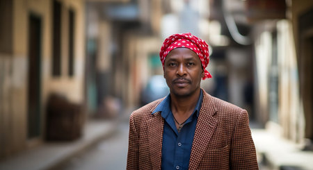 A man wearing a red bandana stands in a blurred city alleyway