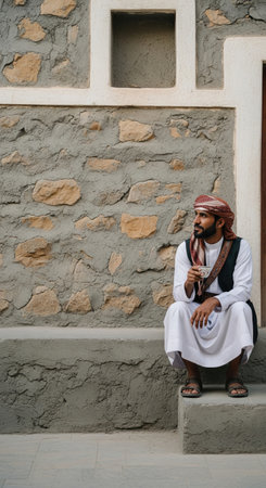 Pensive arab man in traditional clothing is drinking coffee. He is sitting on stone steps and relaxing while looking into the distance.