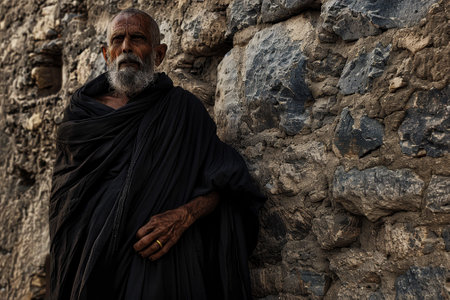 A man in a black robe stands in front of a stone wall. He is wearing a gold ring on his finger