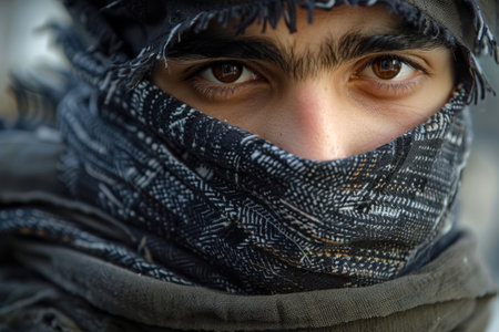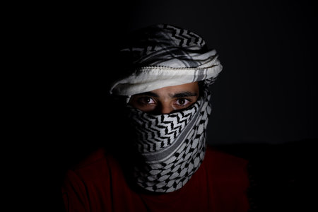 portrait of pearson wearing white keffiyeh on dark background with anger expression on his eyes due to violence and against occupation