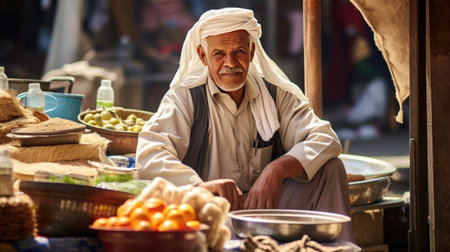 A mature Middle Eastern male in traditional attire, walking through a bustling market street filled with vibrant sights and sounds.