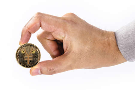 male hand holding e-RMB coin on isolated white background with space copy, china virtual money concept.