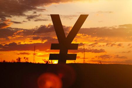 Yen currency at sunset in the rays of the setting sun. Sunset currency. Devaluation of money..