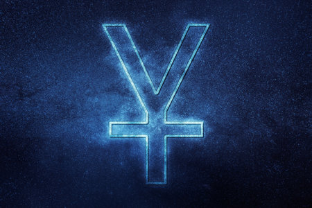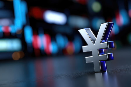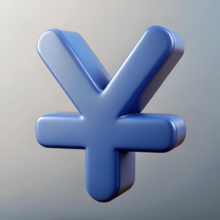 3D Metallic Yen Symbol with Blue Neon Lights in Futuristic Setting