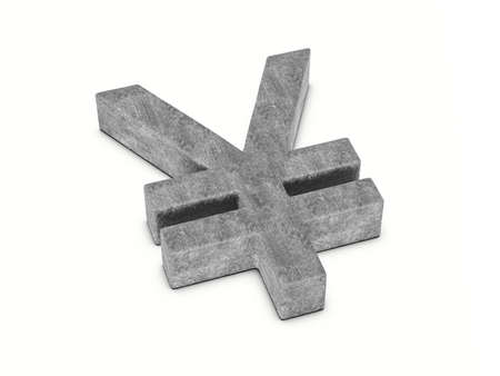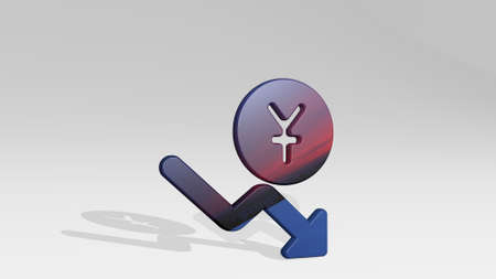 CURRENCY YUAN DECREASE on the wall. 3D illustration of metallic sculpture over a white background with mild texture. business and concept