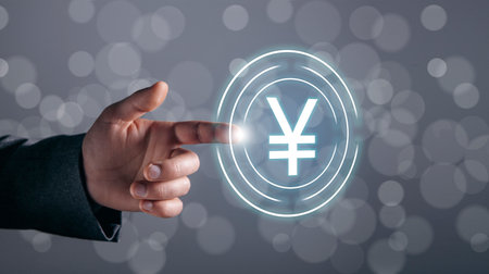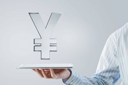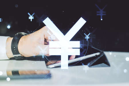 Creative Japanese Yen symbol illustration and finger presses on a digital tablet on background, forex and currency concept. Multiexposure