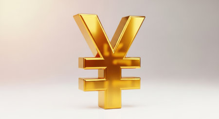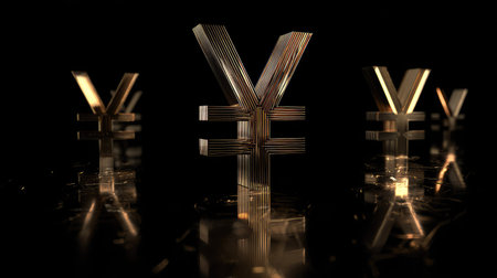 A close-up captures a gleaming gold yen symbol against a deep black backdrop. The lighting highlights the metallic texture and three-dimensional form. This image, with its elegant design and rich color, could be used to represent various financial themes and economic concepts, such as global markets and investment.