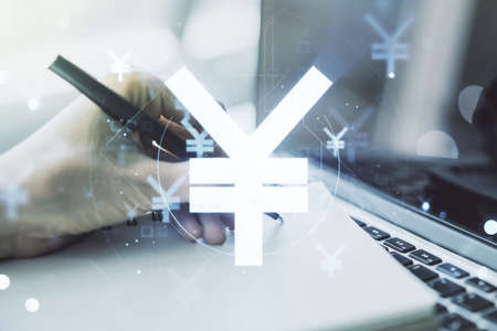 Creative concept of Japanese Yen symbol illustration and hand with phone on background. Trading and currency concept. Multiexposure
