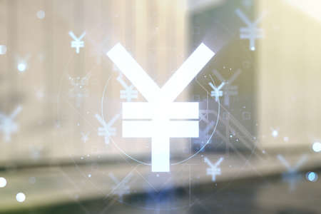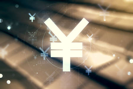 Abstract virtual Japanese Yen symbol illustration on blurry modern office building background. Trading and currency concept. Multiexposure
