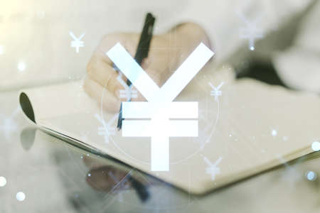 Creative concept of Japanese Yen symbol illustration and man hand writing in notebook on background. Trading and currency concept. Multiexposure