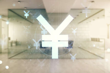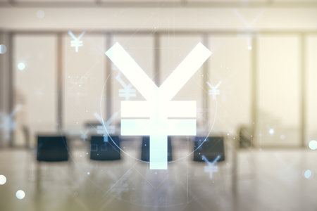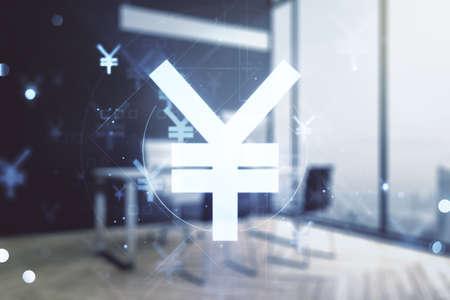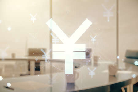 Double exposure of abstract virtual Japanese Yen symbol hologram on a modern meeting room background. Banking and investing concept