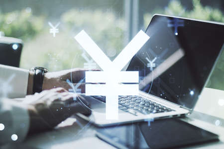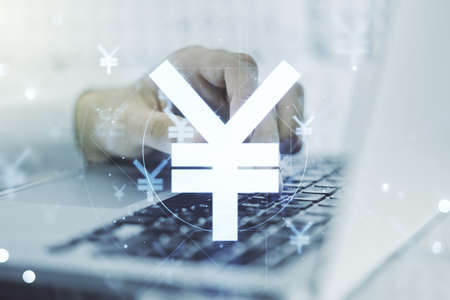 Creative concept of Japanese Yen symbol illustration and hands typing on laptop on background. Trading and currency concept. Multiexposure