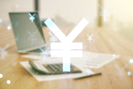 Double exposure of creative Japanese Yen symbol hologram and modern desktop with laptop on background. Banking and investing concept