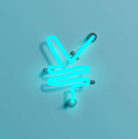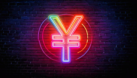 Bright neon sign representing Japan's currency symbol illuminates a textured wall.