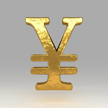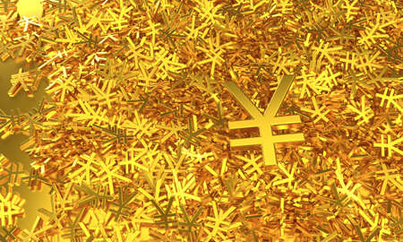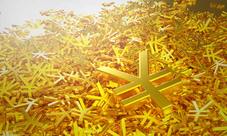 Yen or Yuan money symbol next to Stack of gold coins on a golden background. Currency exchange. 3d rendering.