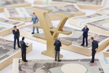 Japanese yen banknotes management for exchange and trading. Manage salaries, income, and expenses to be balanced. Financial, investment, and saving money after retirement concepts.