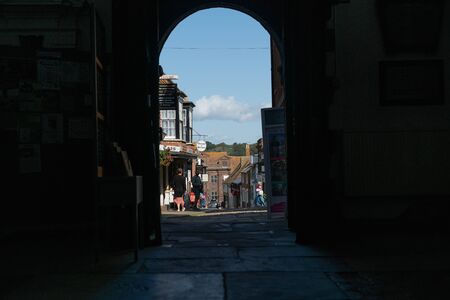 Rye England - August 20 2019; People in street of shops and cafes framed by silhouette arch