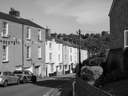 CHEPSTOW, UK - CIRCA SEPTEMBER 2019: Bridge Street colourful houses in black and white