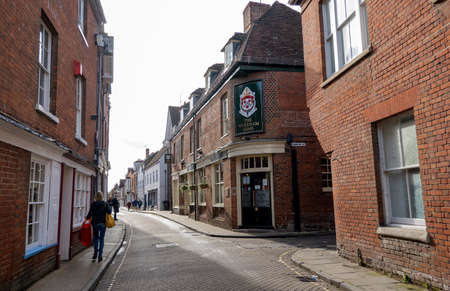 View down street of medieval era historic brick and stone town buildings under beautiful skies in Winchester, United Kingdom