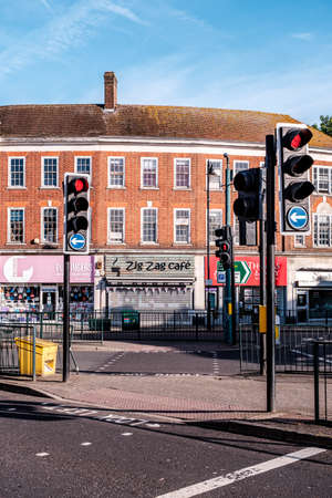 Epsom Surrey, London UK, May 22 2022, Red Traffic Lights At Major Downtown Road Junction