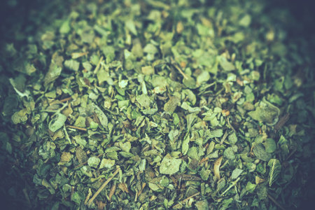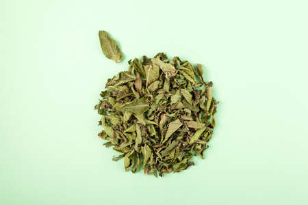Dried mint leaves for making herbal medicinal tea. Top view, Light green background, copy space.