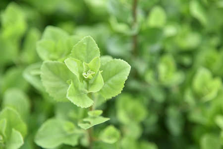 Plectranthus amboinicus , Indian borage or Mexican mint with mint oregano flavor in a garden shined by striped sunlight