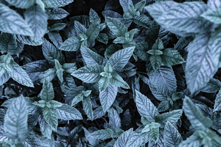 Perfect natural background made of fresh leaves pattern. Dark and moody feel. Top view. Copy space.