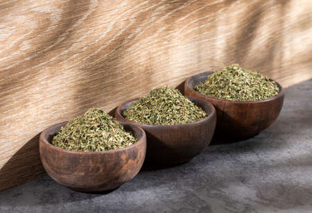 Dried organic tarragon leaves in three wooden bowls - Artemisia dracunculus