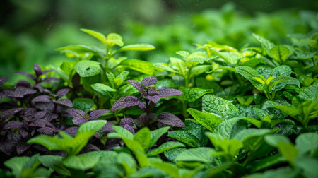 Close-up of water droplets on lush mint leaves, highlighting natural freshness