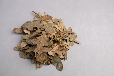 Herbal tea leaves prepared for a cooking in a white plate on a wooden background