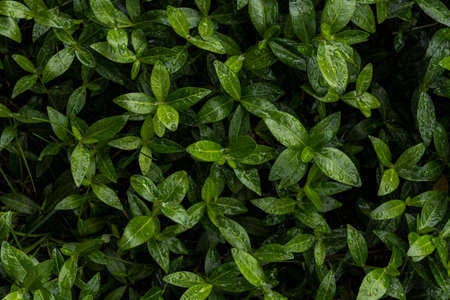 Background from fresh green leaves in raindrops. Green lawn from Vinca.