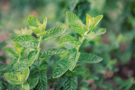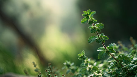 A serene close-up of a mint plant showcasing rich green leaves and delicate purple blossoms, set in a natural environment that highlights beauty and tranquility.