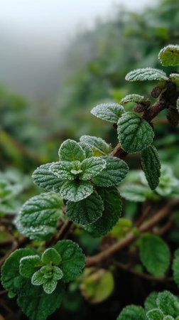 This close-up image features dew-covered leaves amidst a foggy atmosphere, creating a serene and tranquil setting ideal for nature-themed projects.