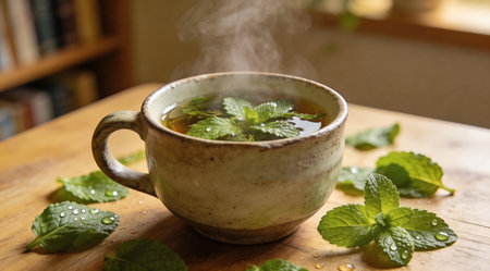 This digital artwork conveys cozy tranquility through diffused indoor lighting and subtle vapor effects in a soothing green-toned palette. Ideal for wellness websites, herbal product branding, relaxation blogs, spa menus, and lifestyle publications targeting health enthusiasts. The refined technical execution with layered textures and atmospheric depth offers versati... AI-generated illustration.